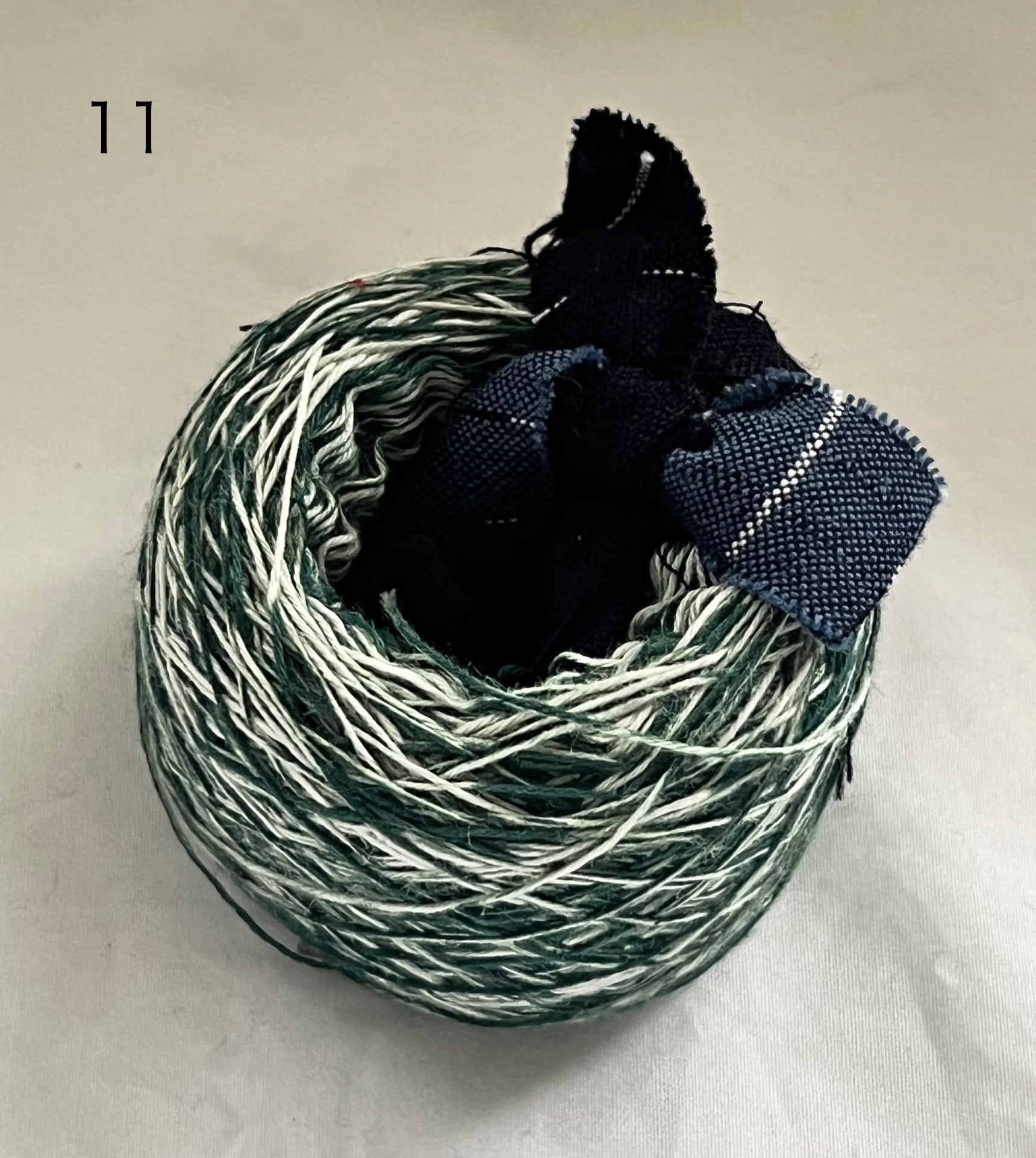 久留米かすりの工程で欠かせないのが「くくり」と呼ばれる防染技法。模様を作るため、染め分けたい部分の糸を縛るのが“くくり糸”です。染色が終わるとその役割を終え、本来なら廃棄されてしまう存在。しかし、役目を終えた後のくくり糸には独特の色合いやグラデーションが生まれ、1つひとつに偶然の表情があります。