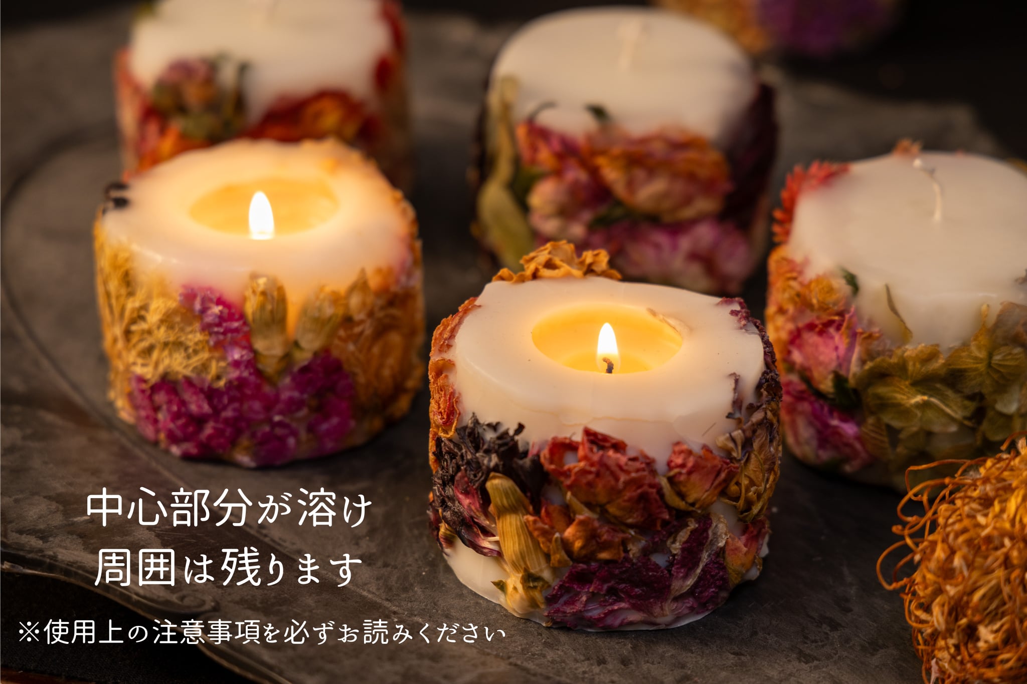 火を灯すと、中心部分がゆっくりと溶けていき、まわりのお花はそのまま残ります。