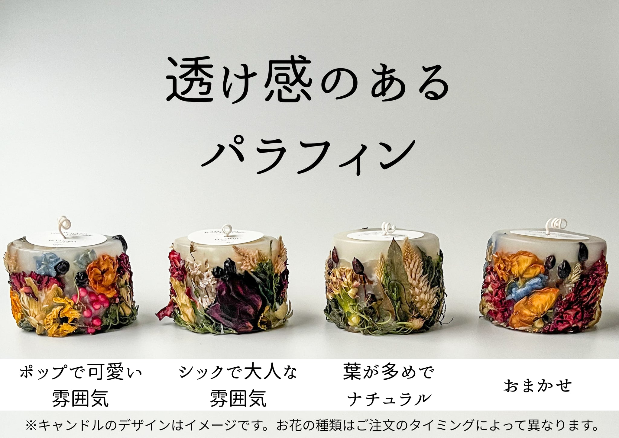 ご注文時に、ワックスの種類・香り・全体の雰囲気をお選びいただけます。